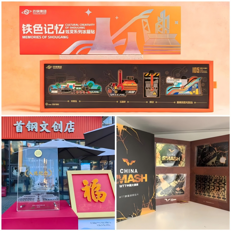 “钢”柔并济主题还展现了铁色记忆炫变系列冰箱贴、北京外事礼物——蚕丝钢《福气安康》绕线画以及使用5G设备同款0.08毫米的极薄规格带钢制作的WTT蝉翼钢明信片等首钢文创产品。