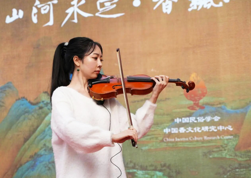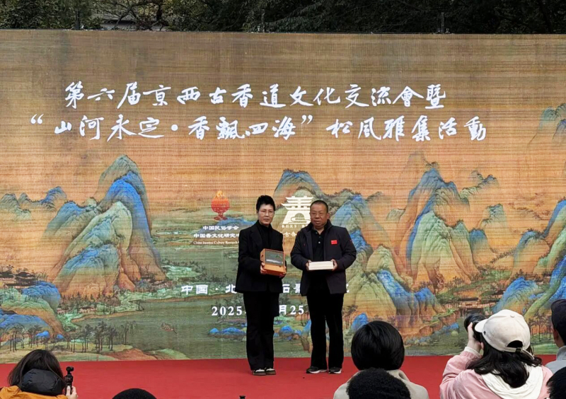 为进一步深化文化体验,松风雅集还设置三大特色环节,让非遗魅力与文化深度相得益彰。“香圣故里与石景山茶香缘”环节,嘉宾们在品鉴 修水“双井绿茶”、闻石景山“灵根古柏”文创香品的同时,欣赏古琴与小提琴跨界合作的《流水》《梁祝》,东方古韵与西方浪漫碰撞出独特火花,展现文化融合的无限可能;“幸(杏)福石景山” 环节,融入慈善寺楸花元素的“古道福茶” 清香四溢,搭配“承恩有杏”文创香品(“杏”谐音“幸”)传递美好寓意,昆曲《游园》的婉转唱腔与古琴《渔樵问答》的悠扬旋律交织,让嘉宾沉醉于传统艺术的魅力之中;“古道茶香”环节,石刻博物馆文创“古道丁香茶品”与“古道丁香香品”登场,茶香与香韵带领嘉宾追溯京西古香道的历史脉络,古琴、箫声与打击乐演绎的《崇天和韵》,搭配世界冠军高崇焱行云流水的太极拳表演,刚柔并济间尽显东方智慧。